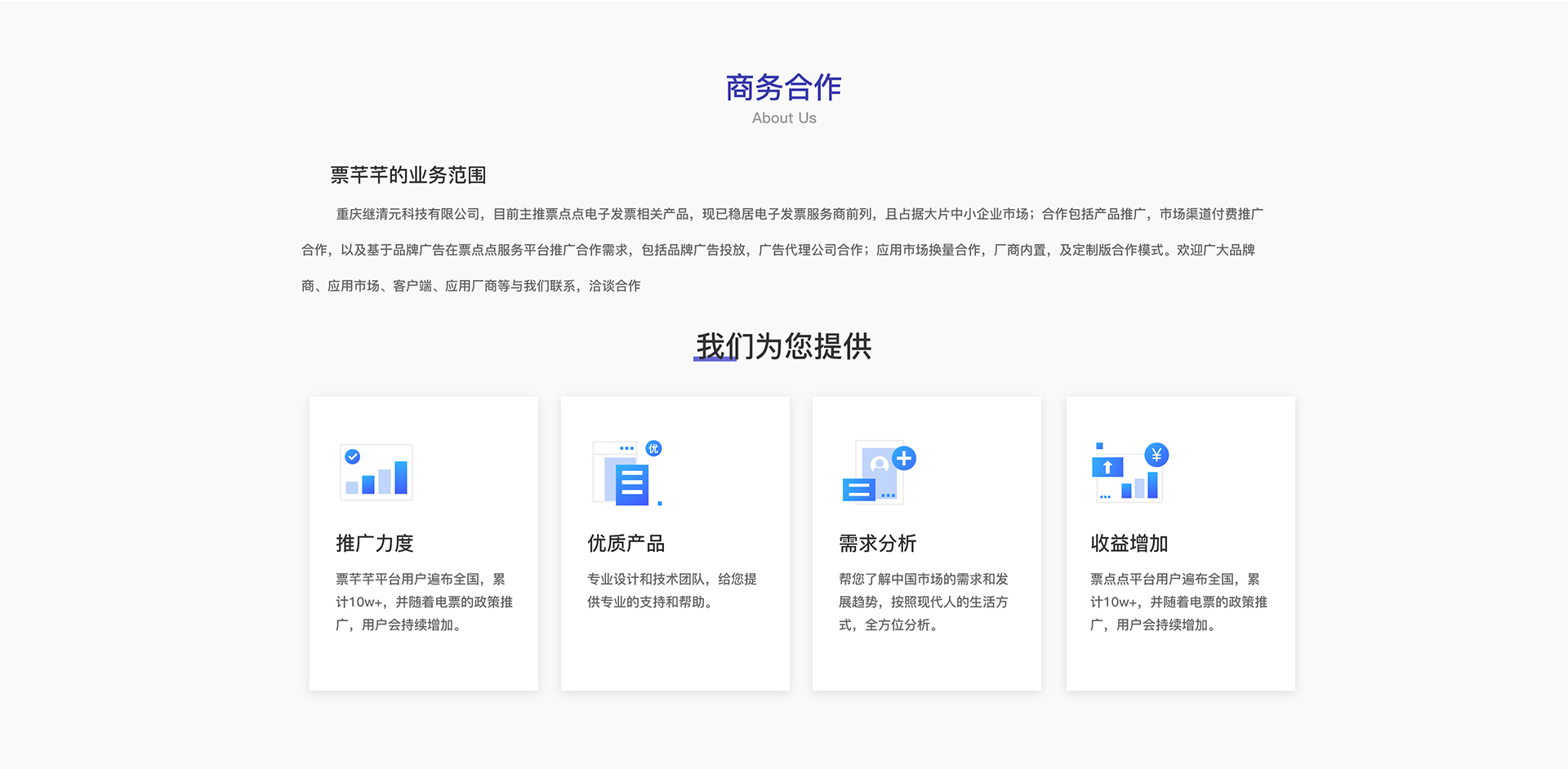 重庆继清元科技有限公司,目前主推票芊芊电子发票相关产品,现已稳居电子发票服务商前列,且占据大片中小企业市场;合作包括产品推广,市场渠道付费推广合作,以及基于品牌广告在票点点服务平台推广合作需求,包括品牌广告投放,广告代理公司合作;应用市场换量合作,厂商内置,及定制版合作模式。欢迎广大品牌商、应用市场、客户端、应用厂商等与我们联系,洽谈合作。
